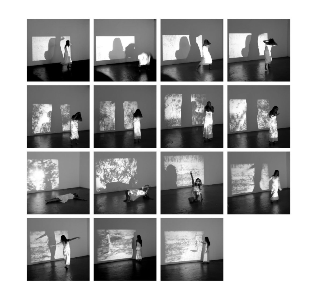 La performance n’illustre rien : elle est un geste d’écoute. Le corps devient écran poreux, membrane sensible où se croisent le passé et le présent, l’intime et le monde, la lumière et l’effacement. À mesure que l’artiste se déplace, les images se recomposent, glissent, se brisent. Une chorégraphie minimale se déploie, faite de micro-gestes, de suspensions, de tournoiements lents — comme si le corps cherchait moins à danser qu’à capter la vibration du monde.